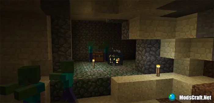 Слева Вы сможете найти огромный горный выступ. Пройдите под ним, чтобы найти подземный данж. Но будьте осторожны, если Вы находитесь в режиме выживания! Ведь в данже есть спаунер зомби! (Координаты: 2329, 72, -108)