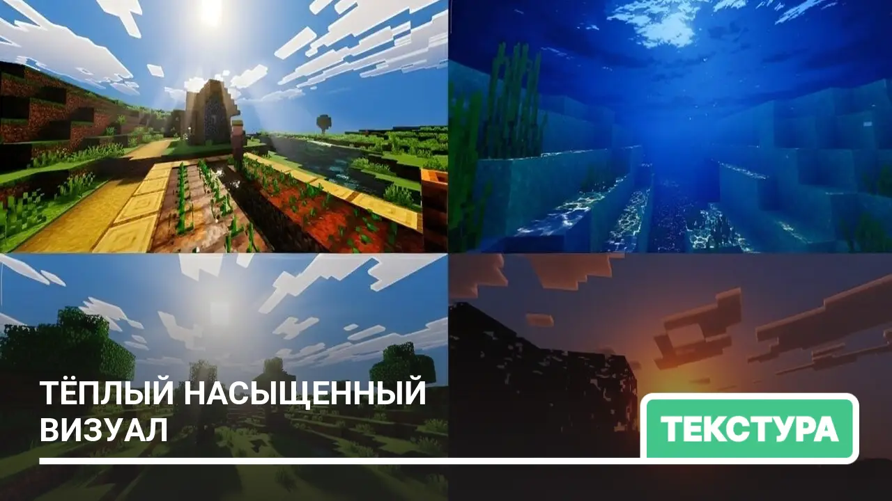 Данный текстур пак добавляет тёплые насыщенные цвета и мягкое освещение для более живой и яркой атмосферы мира…