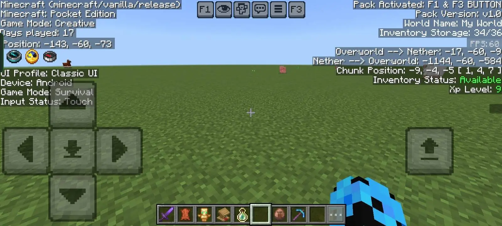 Текстур пак F1 & F3 BUTTON добавляет полезные элементы интерфейса из Java-версии. С ним на экране появятся две удобные кнопки: одна позволяет скрыть HUD, а другая отобразить техническую информацию о мире, координатах и производительности.