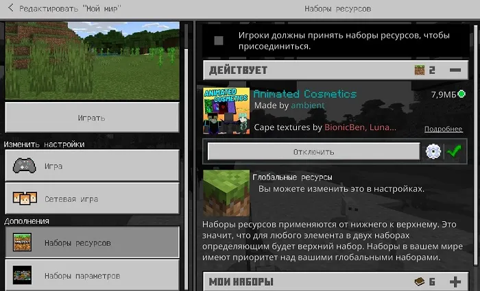 Далее перейдите в мир, активируйте набор ресурсов и нажмите ни иконку шестерёнки.