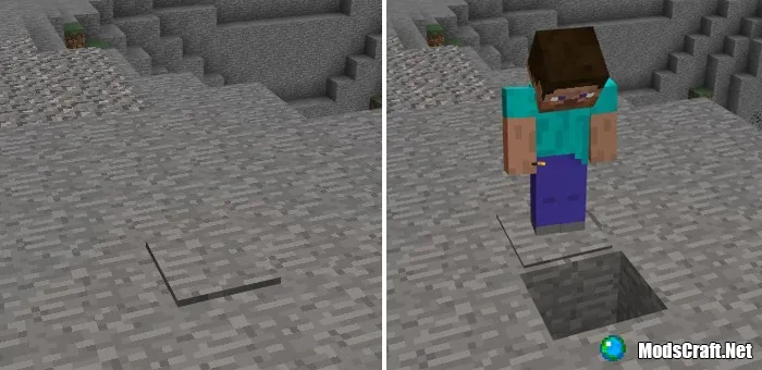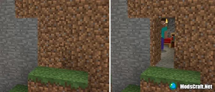 Вот пример, как Вы можете использовать данный ресурс пакет в своём мире. В данном случае я построил небольшую базу внутри горы, а затем использовал дверь из грязи, чтобы скрыть её от посторонних игроков.
