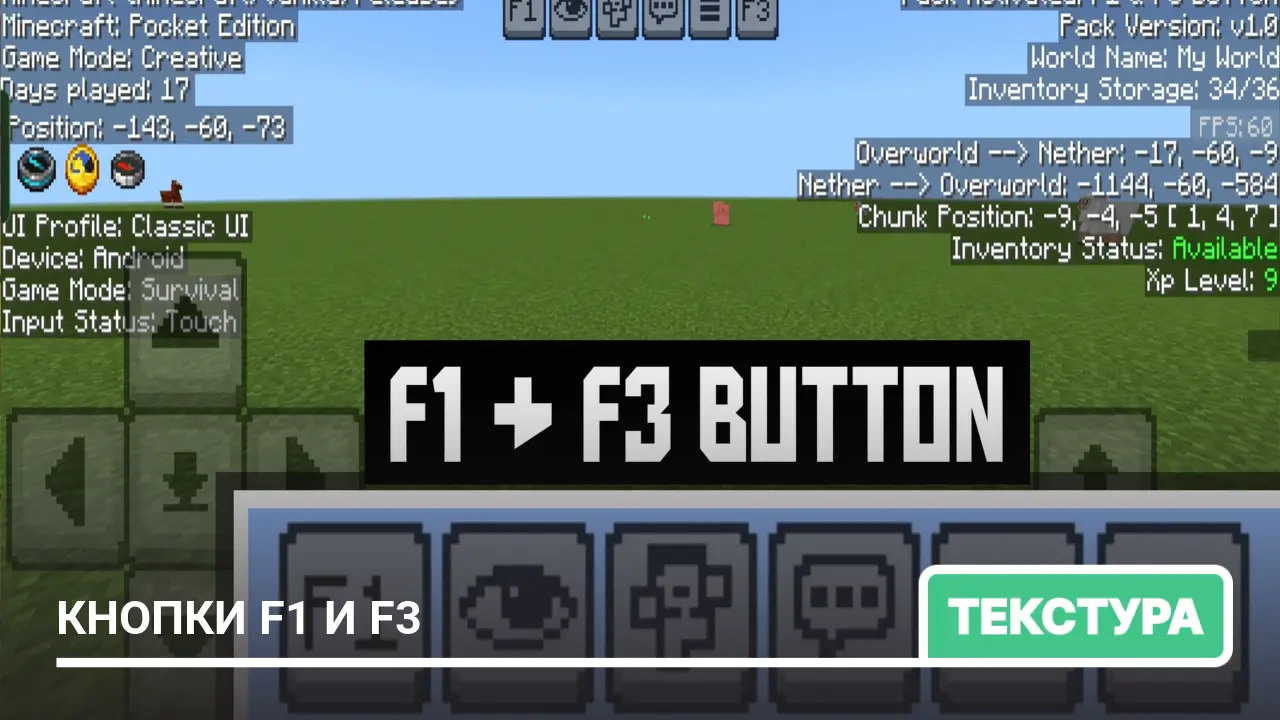 Текстур пак добавляет удобные кнопки F1 и F3 из Java-версии, что позволяет скрывать интерфейс и показывать информацию отладки…
